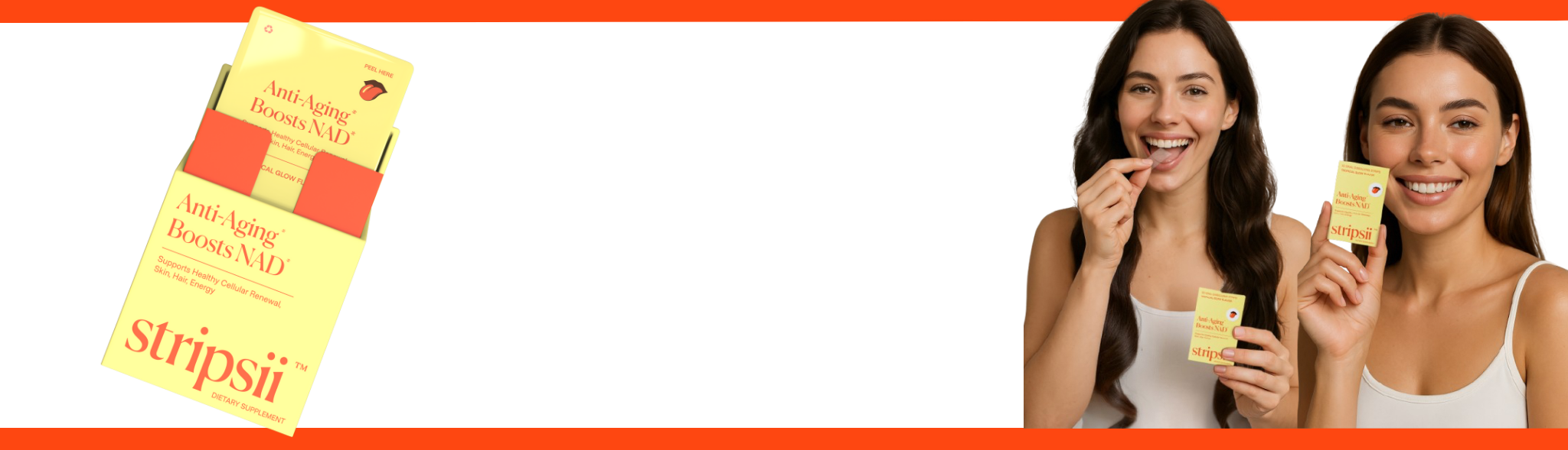 Stripsii™ delivers 9 powerful ingredients—including NAD, Hydrolyzed Collagen, Biotin, Resveratrol, Hyaluronic Acid, and L-Ergothioneine—in an oral dissolving strip that melts on your tongue and starts working in just seconds.